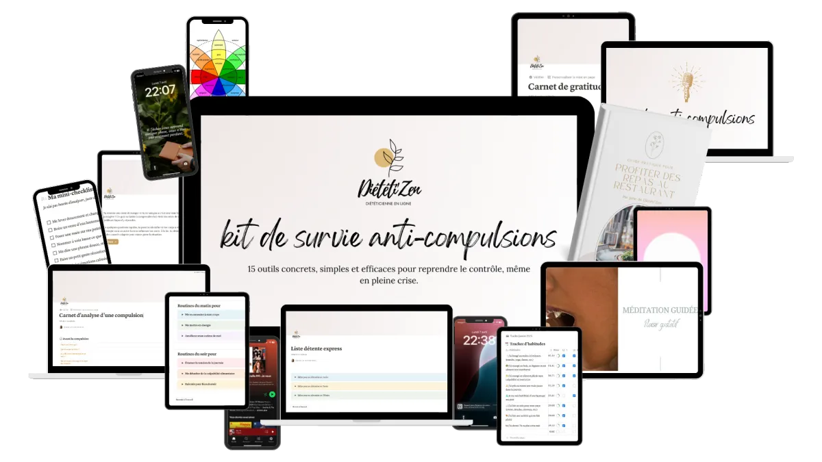 Après une compulsion, c’est souvent la culpabilité qui fait le plus de dégâts. Tu te dis que tu as “encore échoué”, tu culpabilises, et tu repars dans le fameux “foutu pour foutu” : restrictions, frustration… et nouvelle crise derrière. Ces outils sont là pour changer complètement ta façon de réagir. Par exemple avec: